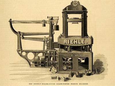 在中國(guó),杠桿式拉伸試驗(yàn)機(jī)被引進(jìn)大概是在上世紀(jì)初,同濟(jì)大學(xué)建設(shè)初期,引進(jìn)一臺(tái)同濟(jì)編號(hào)為:440001的杠桿式拉伸試驗(yàn)機(jī)(圖二),目前,存放于同濟(jì)大學(xué)力學(xué)試驗(yàn)中心。這臺(tái)試驗(yàn)機(jī)上同時(shí)標(biāo)有“RIEHLE BRCXPHILA16494”(圖三)的小字,通過檢索,發(fā)現(xiàn)這臺(tái)試驗(yàn)機(jī)是由位于美國(guó)費(fèi)城的理勒兄弟測(cè)試機(jī)械公司(Riehle Brothers Testing machines Company)生產(chǎn)。